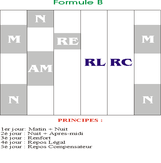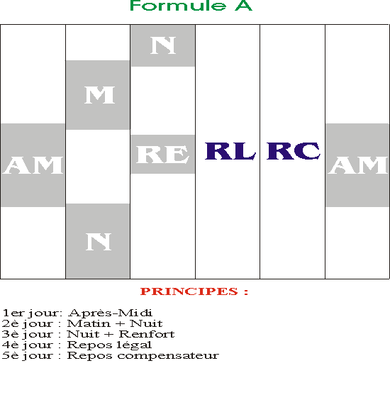 A = après-midi / M = matin / N = nuit / DN = descente de nuit / RL = repos légal / RC = repos compensateur de cycle